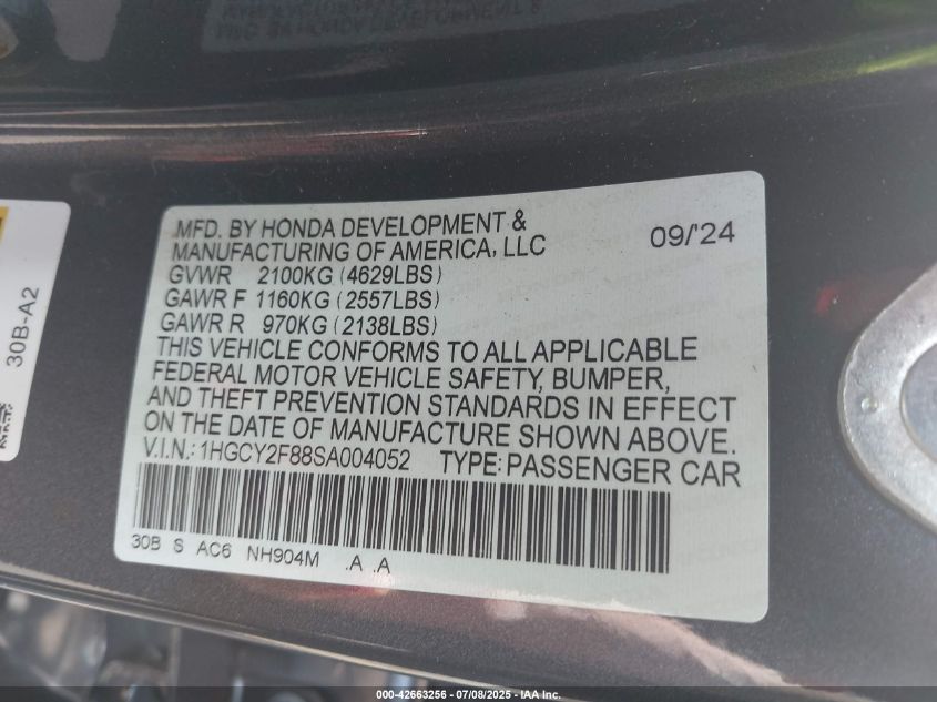 VIN:1hgcy2f88sa004052