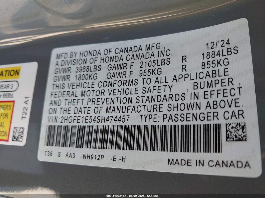 VIN:2hgfe1e54sh474457